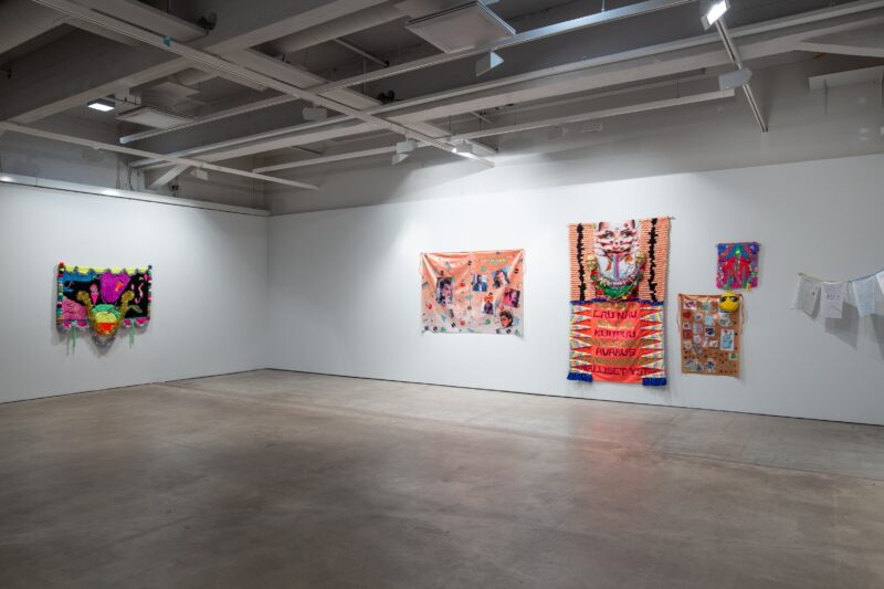 Jonna Karanka: We might feel the groove I make rya rugs. Using sewing and tufting, I create rhythms, compositions, everlasting parties and psychedelic troll pelts. My work is a melange of handicraft traditions, pop culture, hobby glamour and recycled materials. Start date17.11.2018End date06.01.2019 Jonna Karanka: The Humanity Doesn’t Deserve The Finnish Forest Folk Scene, 2018 (detail). photo: Tuomo Tuovinen Ordinary women unknown to art history weaved their emotions and memories into ryas. Bridal ryas in the 18th century often included ancient magical symbols next to Christian ones: looped squares, Turk’s heads and four-leaf clovers, which protected the owner of the rya from evil spirits and bad luck. Textiles have always contained mythologies expressed in motifs and patterns, told through universal symbols shared across cultures. The looped square is found in Egyptian textiles from the fourth century and in the old days was used to protect cattle against witches in Sweden, but today it is perhaps best known as the symbol on the command key on Apple computers. The motifs in my ryas stem from my aesthetic awakening in my early teens. The imagery evolved as I made drawings with highlighter pens and stickers and became a fan of pop culture. We would write “ACID” in capitals in our friendship books and draw a yellow neon smiley face next to it. Installation view. Photo: HAM/Maija Toivanen I would like to thank the Finnish Cultural Foundation for supporting my work. Special thanks to Heta Bilaletdin, Jane Hughes, Sara Milazzo, Katri Sipiläinen and Tuomo Tuovinen for help. Jonna Karanka (b. 1978) is a visual artist and musician. She is also a member of the Sorbus collective. Current exhibitions Free 90 25.04.2025 – 04.01.2026 Tove Jansson: Frescoes and Hobgoblin’s Hat 25.04.2025 – 04.01.2026 Ars Fennica 2025 24.10.2025 – 29.03.2026 Inari Sandell: Total Control 15.11.2025 – 11.01.2026 Marguerite Humeau: Torches 21.11.2025 – 15.03.2026 Tove Jansson Gallery 13.02.2026 – 24.01.2027 Petri Ala-Maunus and Mauno Markkula 13.03.2026 – 31.01.2027 Magdalena Abakanowicz 06.05.2026 – 30.08.2026 KOKIMO: Tablespace 01.06.2026 – 31.08.2026 Leena Luostarinen 16.10.2026 – 04.04.2027