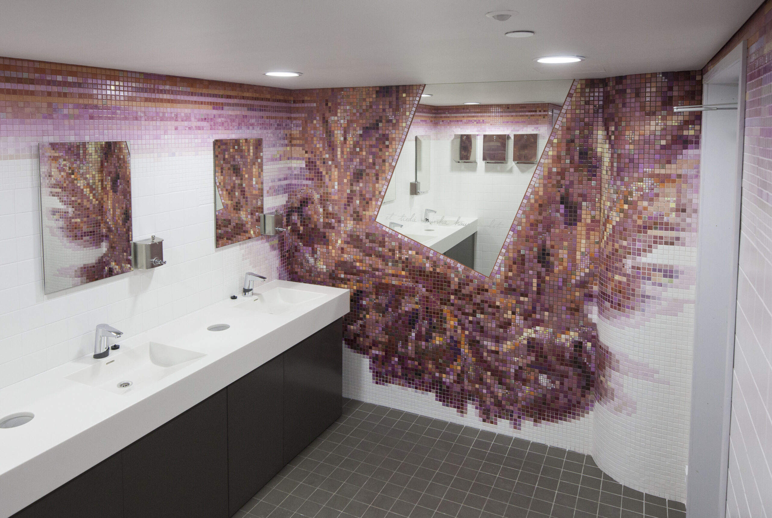 Tuula Lehtinen: You Don’t Know How Beautiful You Are, 2015. Photo: HAM/Maija Toivanen. You Don’t Know How Beautiful You Are Artist Tuula Lehtinen Tennis Palace, Eteläinen Rautatiekatu 8, 00100 Helsinki Indoor Sculpture Limited access: the work is available to view for the users of the premises only. Tuula Lehtinen’s You Don’t Know How Beautiful You Are is a mosaic composed of ceramic tiles painted with porcelain overglaze. Glowing in delicate shades of pink and purple, the work features indistinct motifs that evoke flowers and ornamental frames. In addition to its mosaic surface, the piece incorporates the text “You Don’t Know How Beautiful You Are,” inscribed directly onto the mirror. The work was custom-designed for the toilets at HAM Helsinki Art Museum as part of the renovation of the Tennis Palace and the expansion of the museum’s premises. Mosaic is a technique built from countless small elements, and in Lehtinen’s hands this ancient method is reinterpreted through a contemporary lens. The work is based on photographs taken by the artist. Its surface resembles a pixelated digital image, with each tile corresponding to a single pixel. As in a pixelated photograph, the image resists clear legibility. Instead, the delicate, sensual, candy-coloured palette comes to the fore, enveloping the space in a soft, atmospheric glow. The title of the work originates from small street stickers encountered by the artist while living in Bergen. Lehtinen noticed these stickers affixed to lampposts throughout the city, each bearing the message “You don’t know how beautiful you are.” The same phrase is recontextualised on the mirrored surface of her work. Visitors encounter the text as they look at themselves in the mirror, prompting a moment of self-recognition. Rather than encouraging critical self-scrutiny, the work invites viewers to regard their own reflection with warmth and empathy. Tuula Lehtinen (b. 1956) is a printmaker and contemporary artist who lives and works in Tampere. Her practice reflects a sustained interest in the relationship between art and architecture, with many of her works engaging directly with questions of beauty and how it is experienced. Lehtinen has realised numerous public artworks in Finland, Sweden, and Norway. Alongside her artistic practice, she is the founder and head of the Frei Zimmer agency, which specialises in the production and coordination of public art. Lehtinen held a professorship at the Bergen Academy of Art and Design from 2007 to 2010, and her work has been exhibited widely in Finland and internationally. The work belongs to the City of Helsinki’s art collection, which is managed and curated by HAM. At map