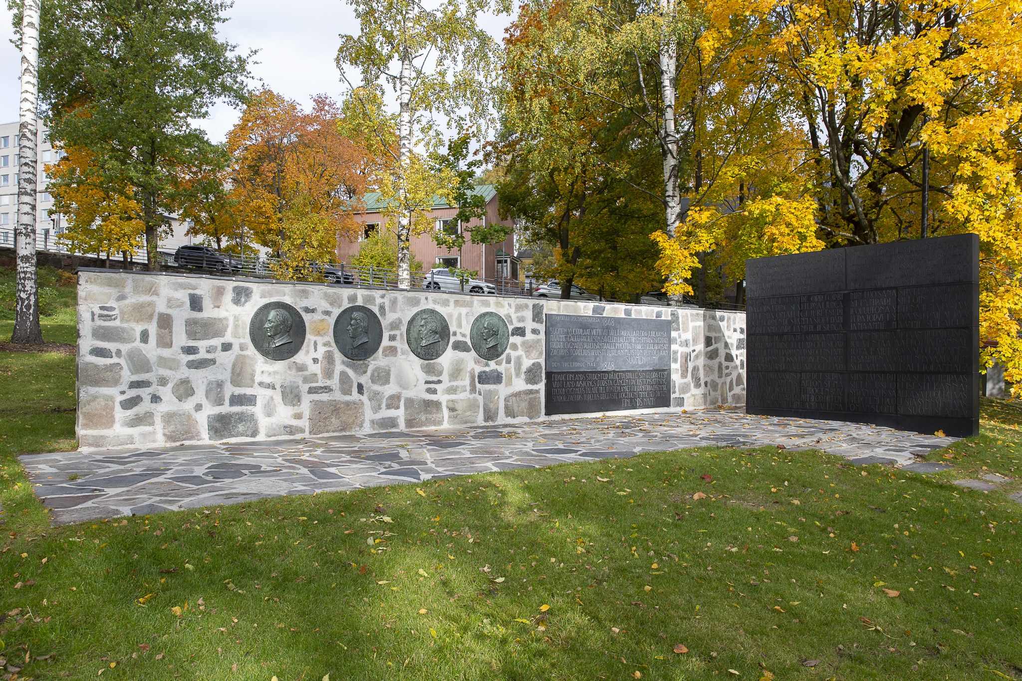 The monument is a collaborative work by Erik Bryggman and Viktor Jansson. The monument’s wall, pool and floral arrangements were designed by Erik Bryggman, an architect, whose roots were in sensuous Neo-Classicism and who combined severe Modernism with lyrical ambience. Viktor Jansson (1886-1958) is known for his numerous public sculptures characterized by architectural Classicism and created the bronze medallions, positioned on the wall.