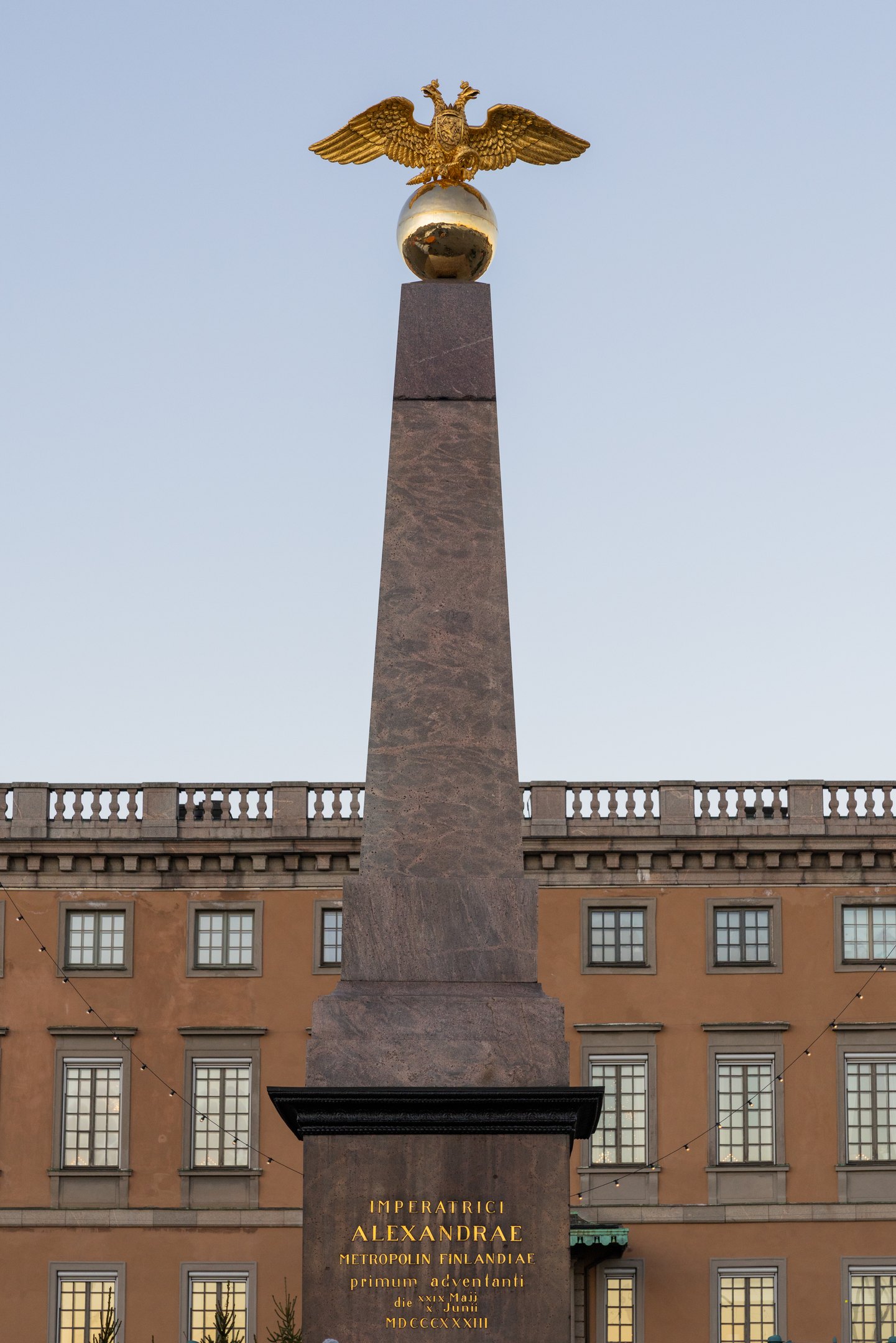 Carl Ludvig Engel: Keisarinnankivi / The Stone of The Empress, 1835. Photo: HAM/Kerttu Malinen. The Stone of The Empress Artist Carl Ludvig Engel Kauppatori, Kaartinkaupunki, Helsinki ‘The Stone of the Empress’ is the oldest public memorial in Helsinki. It was erected in the Market Square to commemorate the Empress Alexandra’s (the German-born wife of Nicholas I), first visit to Helsinki. She visited the City in 1833 with her husband, who came to inspect the construction of Helsinki’s new centre. The memorial is an obelisk cut in red granite. A bronze globe is set on top of the obelisk, and the two-headed eagle of Russia. The obelisk form, already a basic memorial type for glorifying sculptures depicting historical events and in memorial stones during Antiquity in Europe was adopted for ‘The Stone of the Empress’. This work is typical of the early 19th century obelisks which followed the traditions of the Antique forms. The stone includes the following, explanatory texts in Finnish and Latin: “Keisarinna Alexandralle Suomen pääkaupungissa ensikerran käyneelle XXIX.p:Touko X.p: Kesä MDCCCXXXIII. Imperatrici Alexandrae Metropolin Finlandiae Primum Adventati die XXIX Maji X Juni MDCCCXXXIII.” The English translation reads: “To Empress Alexandra on her first visit to the capital of Finland May 29 – June 10, 1833.” The Memorial is placed where Alexandra and Nicholas stepped ashore from the Ischora, the steamship that brought them to Helsinki. ‘The Stone of the Empress’ was unveiled on December 18, 1835 on Nicholas’s nameday. Russian sailors removed the bronze globe and two-headed eagle on April 17, 1917. However, in 1971, they were returned. The work belongs to the City of Helsinki’s art collection, which is managed and curated by HAM. At map