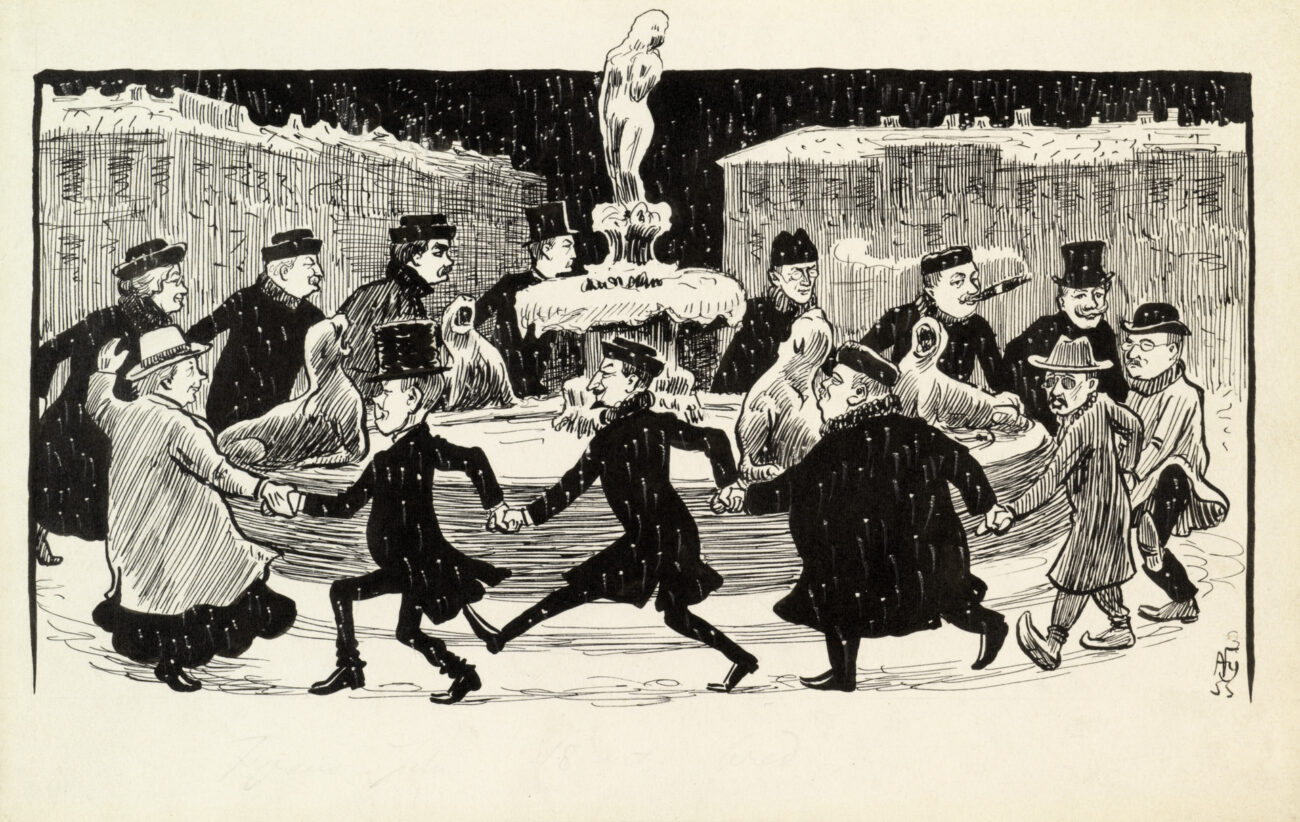 Alexander Thiodolf Federley: Piiritanssi Havis Amandan ympärillä, 1909. Kolmetoista tunnettua helsinkiläistä pyörii piiriä Havis Amandan patsaan ympäri. Mukana ovat merkinnän mukaan mm. Lucina Hagman, Resvoj, Rafael Lindqvist, Julius Hirn, Danielson-Kalmari ja professori Sundvik. Kuva: Helsingin kaupunginmuseo.