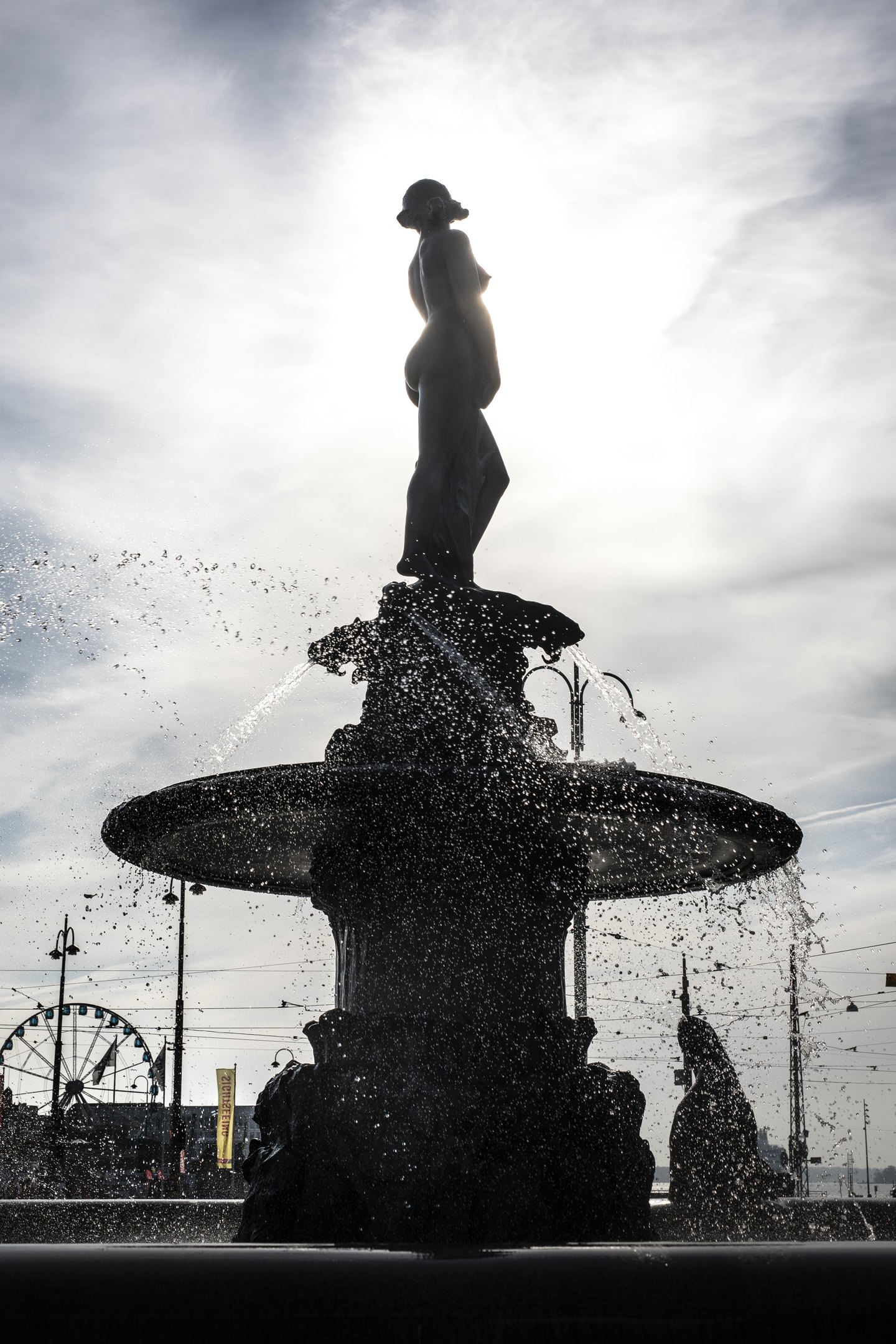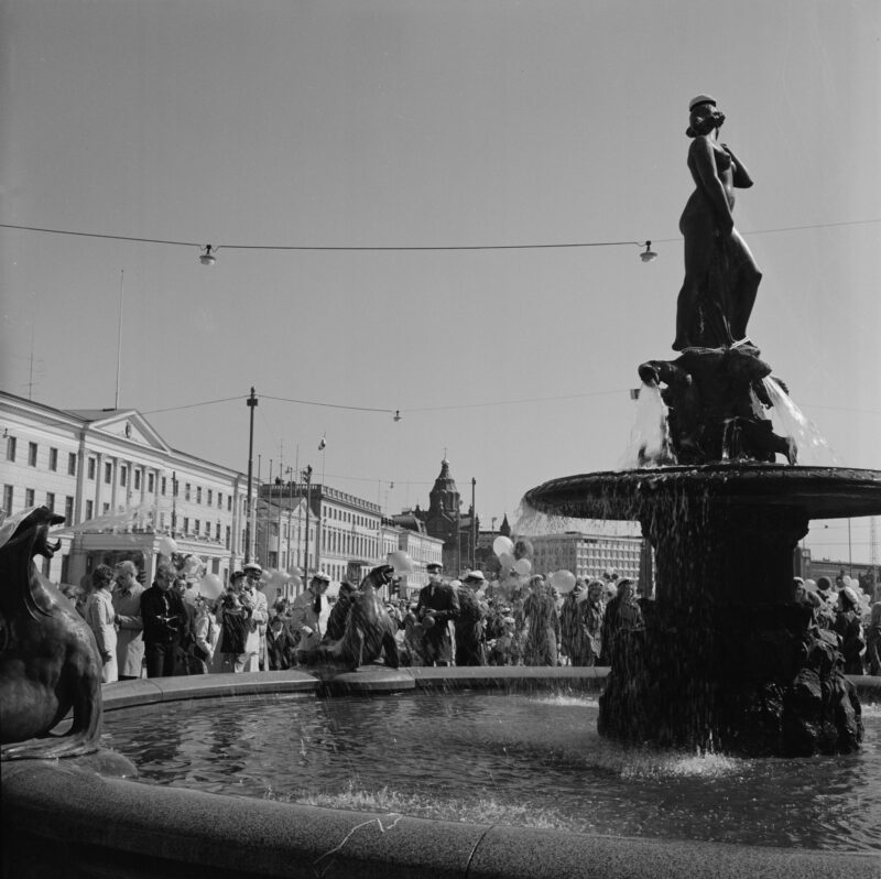 Vallgren’s fountain was unveiled at the Market Square on 20 September 1908. The inauguration took place early on a Sunday morning, with no publicity or official ceremonies. The unveiling immediately launched Finland’s first public art debate of broader scope. The opposing sides were the women’s rights movement and the male art elite, as well as the general public vs. experts, the working class vs. “bourgeois spendthrift culture” and even the Finnish and Swedish speaking educated classes debated against each other. The nudity of the female figure was particularly disapproved. Vallgren expressed his surprise and offense by the uproar in a letter to the Finnish press from Paris. “It is a sea nymph rising from the waves. It is self-evident that she has to be naked under such conditions.”