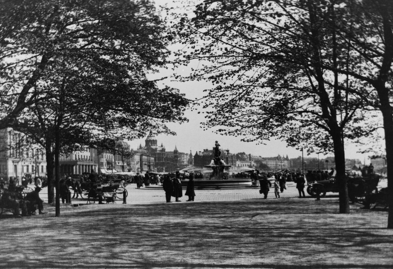 Kauppatori ja Havis Amanda nähtynä Kappeliesplanadilta. Kuva: Helsingin kaupunginmuseo.