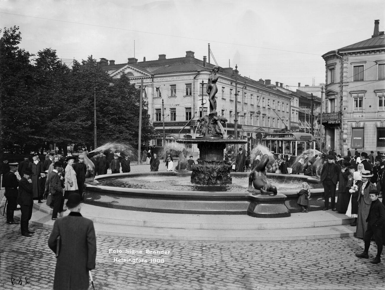 Havis Amanda Kauppatorilla paljastustilaisuuden jälkeen, 1908. Kuva: Signe Brander / Helsingin kaupunginmuseo.