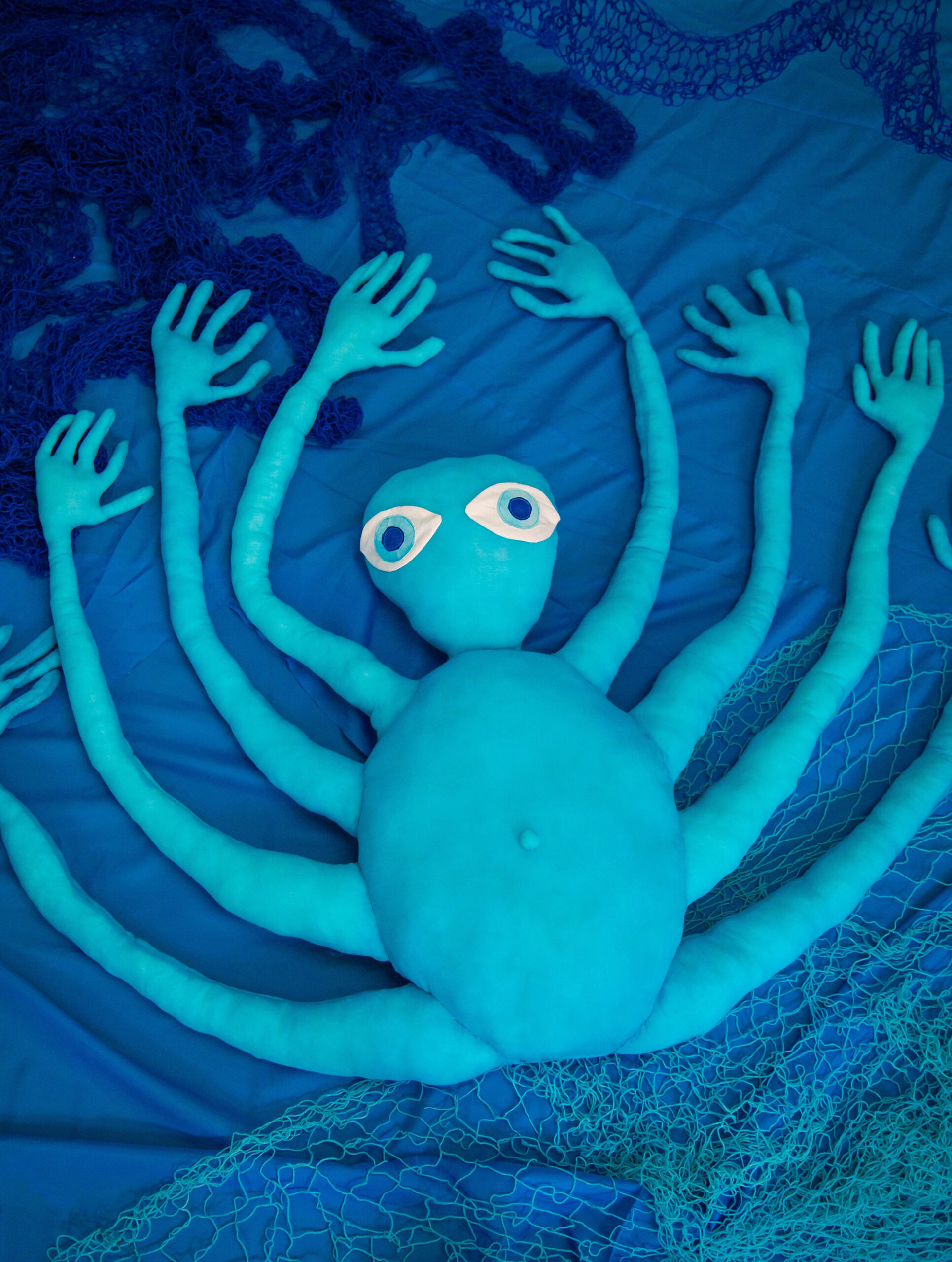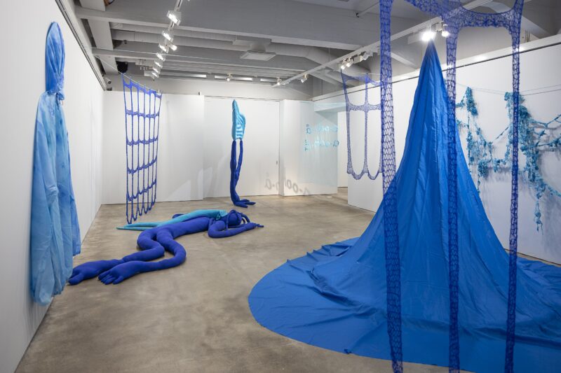 Corinna Helenelund: Bakgården på sjunde våningen Bakgården på sjunde våningen är ett mellanrum i tillvaron, en mental balkong, inte inuti, inte utanför men ett inre utanför. Om det är ett drömrum är det drömmande som ett sätt att se, en plats att vara i, snarare än en dröm att tolka. Börjar21.01.2020Slutar08.03.2020 Corinna Helenelund: studio foto. foto: Elis Hannikainen En del av verken hör till en serie vid namnet ’Pain Things’. De kommer ur en smärtlindringsmetod som bygger på visualisering av fysiska och mentala förnimmelser genom form, färg och textur. De visualiserade formerna kan lyftas ut ur kroppen och blir då som uppmjukade fristående förvrängningar, bångstyriga misstolkningar av de inre landskapen. Tillsammans skapar de ett slags subjektivt känsloalfabet, förnimmelserna får former att kännas igen i, vara hemma i. Verken är i olika nyanser av blått. Blått är mörker försvagat av ljus.* ”För mig är dessa verk som skuggsubstanser, frysta ögonblick ur något väldigt flytande. De kommer från platser där ord inte beter sig, där händer hålls av ett förkroppsligat sökande-görande-tänkande, där att gripa och begripa ligger varandra nära.” Utställningsvy. Foto: HAM/Sonja Hyytiäinen Corinna Helenelund (f.1985, Helsingfors) utexaminerades från bildkonstakademin 2013 och har sedan dess arbetat med skulptur och installation, framförallt i textila material. I utställningen möts verk från 2017 – 2020. Delar har visats tidigare på Krets 1 på Pesula, Nickby (2019), på HIAPs Open Studios på Sveaborg (2018), på utställningen Self Bites Self på Kunstverein Göttingen, Tyskland (2018), samt på utställningen A Waiting Room på The Community, Paris, (2017). Verken är gjorda med understöd av Svenska Kulturfonden, Centret för konstfrämjande och HIAP. *Ur Goethes färglära Aktuella utställningar Fria 90 25.04.2025 – 04.01.2026 Tove Jansson: Fresker och Trollkarlens hatt 25.04.2025 – 04.01.2026 Ars Fennica 2025 24.10.2025 – 29.03.2026 Inari Sandell: Total Control 15.11.2025 – 11.01.2026 Marguerite Humeau: Facklor 21.11.2025 – 15.03.2026 Tove Jansson-galleriet 13.02.2026 – 24.01.2027 Petri Ala-Maunus och Mauno Markkula 13.03.2026 – 31.01.2027 Magdalena Abakanowicz 06.05.2026 – 30.08.2026 KOKIMO: Tablespace 01.06.2026 – 31.08.2026 Leena Luostarinen 16.10.2026 – 04.04.2027