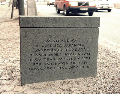 © Foto: HAM Helsingfors konstmuseum Japans minnesten Konstnär Okänd Norra kajen 4, Kronohagen, Helsingfors Vid Norra kajen 6 restes 1982 en minnessten i grå granit. Texten påminner om att också träden på Norra kajen är ett slags minnesmärke, de planterades nämligen hösten 1943 på uppdrag av Japans kejserliga sändebud som en symbol för vänskapen mellan Japans och Finlands folk.Texten lyder: ”På åtgärd av kejserliga japanska sändebudet T. Sakaya planterades hösten 1943 dessa träd såsom symbol för vänskapen mellan Japans och Finlands folk”. At map
