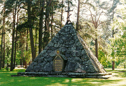 Peter Clodt von Jürgensburg: Minnesmärke över offren i bombardemanget av Sveaborg, 1860. © Foto: HAM Helsingfors konstmuseum Minnesmärke över offren i bombardemanget av Sveaborg Konstnär Peter Clodt von Jürgensburg Kadettparken, Sandhamn, Helsingfors Krimkriget gav eko också i Finland. England och Frankrike hade gått samman för att motarbeta Rysslands expansion på Turkiets bekostnad. År 1854 stannade den engelsk-franska flottan alla fartyg som seglade under rysk flagg på Östersjön. Självfallet beslagtogs även finländska fartyg. Motståndet mot England vaknade hos borgarna och i städerna bildade man frivilliga försvarsstyrkor vid sidan av den ordinarie ryska armén. Det finska uttrycket ”Oolannin sota”, Ålands krig, kommer sig av att Åland var den huvudsakliga krigskådeplatsen. Kriget var speciellt vid kustområdena ett förintelsekrig och spred sig österut längs västkusten. Sommaren 1855 anlände flottan till Sveaborg och började bombardera fästningen. Trots den häftiga eldgivningen höll befästningen och de allierades flotta lämnade Finska vikens kuster. Minnesmärket restes på åtgärd av ryska flottan över de ryska soldater som föll i bombardemanget. På minnesmärket finns följande text på ryska: ”Till minne av de 63 matroser och soldater som omkom när den engelsk-franska flottan bombarderade Sveaborg 10.8.1855”. Minnesmärket ingår inte i Helsingfors stads konstsamling som förvaltas av HAM. At map