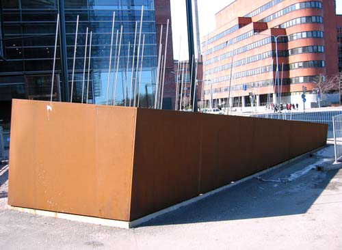 Pekka Helin: Utan titel, 2000. © Foto: HAM Helsingfors konstmuseum Utan titel (2) Konstnär Pekka Helin Östersjötorget 2, Helsingfors Arkkitekt Pekka Helin har planerat detta verk som finns i närheten av Sitras hus (Jubileumsfonden för Finlands självständighet) i Gräsviken. I stadsplanen fanns ett krav på ett offentligt konstverk, en liten park eller dylikt som skulle resas på detta område. Verket skulle samtidigt fungera som ett slutande element till Brudgatan, som planerades till gågata. Idén till verket har arkitekten fått från Tammasaari kobbe som tidigare fanns på denna plats, men som fick ge vika då man fyllde ut marken till hamnområdet under 20-talet. Verket är framställt i Estland. Den brunaktiga färgen kommer från använd Cor-ten stål. Ovanpå locket finns små runda hål, och i dessa hål finns tunna rör av rostfritt stål. Rören föreställer den vass som tidigare växte på kobben. Inuti den ihåliga, rektangulära stålkonstruktionen finns ett maskineri som transporterar ljus till de tunna stålrören. Maskineriet står dock oanvänt eftersom ljuseffekterna inte syns i det annors så väl uppbelysta området. Verket ingår inte i Helsingfors stads konstsamling som förvaltas av HAM. Pekka Helin har bl.a. planerat Nokia-huset, Ilmaris huvudkontor och riksdagens tilläggsbyggnad. At map