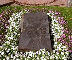 © Kuva: HAM Helsingin taidemuseo Hans van Sandenin hautakivi Taiteilija Robert Stigell Vanhankaupungintie 9, Helsinki Hans van Sanden oli alankomaalaissyntyinen mies, josta kaupankäynnin myötä tuli Helsingin perustamisen aikoihin kaupungin varakkain porvari. Hän kävi kauppaa ennen kaikkea saksalaisten kaupunkien kanssa. Vuoden 1560 tulliluetteloiden mukaan van Sandenin kauppavaihto oli puolet koko silloisen Helsingin tuonnista. Van Sanden meni naimisiin Herttoniemen Jägerhorneihin kuuluneen Anna Henrikintyttären kanssa ja otti käyttöönsä Jägerhornien vaakunan. Hän sai haltuunsa myös suvun kartanon Båtsvikin. Suurella omaisuudellaan ja liittymällä vanhaan maa-aatelistoon van Sanden varmisti itselleen ja jälkeläisilleen korkean sosiaalisen aseman Helsingin porvariston keskuudessa. Robert Stigell teki 1890 kopion Hans van Sandenin alkuperäisestä kalkkikivisestä hautakivestä, joka todennäköisesti oli mennyt huonoon kuntoon. Hautakiven merkinnöistä ja van Sandenin kuolinvuodesta on eriäviä tulkintoja. Hautakivi on matala paasi, jossa on vaakuna ja teksti ”Hans van Sanden end sine erven anno domino 1590”. Hautakiveä ympäröi 4 pylvästä ja ketju. Kartalla