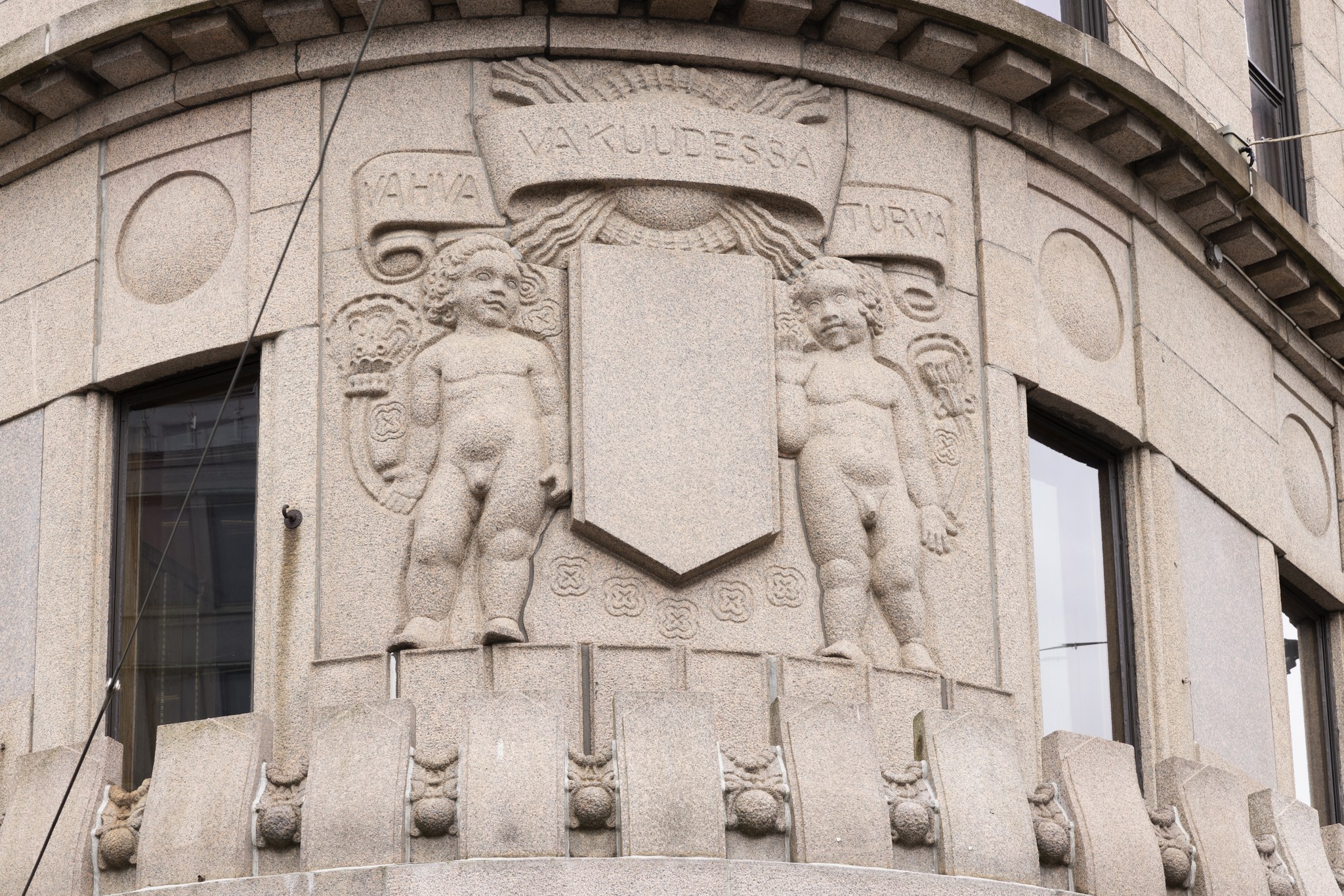Gunnar Finne ja Viktor Jansson: Kilpiveistos, 1913. Kuva: HAM / Kerttu Malinen Kilpiveistos Taiteilija Gunnar Finne, Viktor Jansson Vakuutusyhtiö Kalevan talo, Mannerheimintie 7, Kluuvi, Helsinki Gunnar Finne teki useita koristelutöitä tunnetuille arkkitehdeille. Tämä osittain siksi että 1920-luvulla arkkitehdin toimenkuva koki tietyn muutoksen, joka erotteli arkkitehdin ja kuvataiteilijan roolit esimerkiksi juuri rakennusten koristelussa. Gunnar Finne oli opiskellut arkkitehtuuria ennen taideopintojaan, joten hän osasi hahmottaa teoksensa miellyttäviksi kokonaisuuksiksi. Hän työskenteli usein yhteistyössä arkkitehtien kanssa. Kilpiveistos koristaa arkkitehti Armas Lindgrenin piirtämää Vakuutusyhtiö Kalevan pääkonttorin sisäänkäyntiä. Veistos korostaa rakennuksen palatsimaista henkeä, joka viestittyy uusbarokkisista sisätiloista sekä julkisivun jyhkeästä graniittisesta seinäpinnasta. Veistoksesta voidaan lukea seuraava teksti ”Vahva Vakuudessa Turva”. Teos ei kuulu HAMin hallinnoimaan Helsingin kaupungin taidekokoelmaan. Kartalla