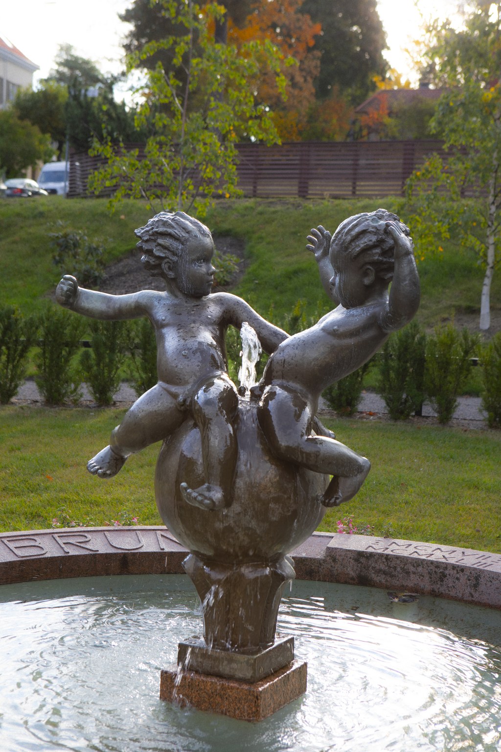 Viktor Jansson: Leikkivät pojat III / Raivaajien kaivo, 1942. Kuva: HAM/ Kerttu Malinen Leikkivät pojat III / Raivaajien kaivo Taiteilija Viktor Jansson Kramerinlehto, Kulosaarentie/ Bertel Jungintie, Kulosaari, Helsinki Vuorineuvos Anders Kramerin lahjoittama muistomerkki paljastettiin 1943. Muistomerkkikokonaisuus on sommittelultaan tasapainoisen ja harmoninen. Vesialtaan on suunnitellut arkkitehti Bertel Jung yhdessä kuvanveistäjä Viktor Janssonin kanssa. Altaan punagraniittisiin reunakiviin on kaiverrettu teksti: Raivaajain kaivo / Pionjärernas brunn. Suihkulähteen keskellä on Viktor Janssonin (1886-1958) Leikkivät pojat -veistos, jota taiteilijan tuotannossa löytyy useina eri versioina. Kahden pojan huima leikki pallon päällä antaa elämäntäyteisen, mutta myös haikean vaikutelman. Palloon on kirjoitettu kohokirjaimin F.M Franzénin runon Glädjens ögonblick alkusanat ”Sörj ej den gryende dagen förut” eli ”Älä sure ennalta huomista päivää”. Teoksesta välittyy epäsuorasti viesti taiteilijan mahdollisuudesta ylittää tuo aikuisten ja lasten välinen raja, leikin ja todellisuuden väliin piirretty viiva. Viktor Janssonin veistoksissa näkyy myös klassismin runollinen ja tyylitelty muoto. Hienostuneisuus ja keveys ovat tasapainossa materiaalien luontaisen jähmeyden ja raskauden kanssa. Pronssiin valetun veistoksen korkeus on 133 cm. Suihkukaivoveistoksen graniittijalustaan on kuvattu reliefinä Kulosaaren kunnan vaakunaksi aikoinaan suunniteltu ehdotus. Vaakunakilpeä kehystää kaksi tyyliteltyä särmäneula -nimistä, Suomenlahdessa esiintyvää harvinaista kalaa. Kilven keskellä erottuu saari, rakennuksia ja taustalla kuusikkoa. Yläosassa on Helsingin vaakuna. Sinänsä ansiokkaasta ehdotuksesta ei kuitenkaan tullut kunnan virallista vaakunaa. Teos kuuluu Helsingin kaupungin taidekokoelmaan, jota HAM hallinnoi ja kuratoi. Kartalla